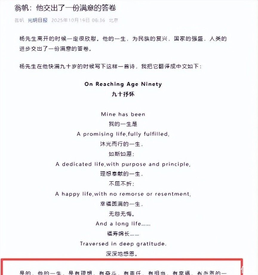 27. 谁能想到,多年前那次采访中的朴素言语,竟在今日显得如此掷地有声。就在10月19日,翁帆于《光明日报》发表悼文,深情写道:“他的一生,是有理想、有幸福、有感恩的一生。能拥有他多年的陪伴,我何其有幸。”